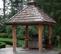 Figure 3. It's common for outdoor kitchens to see use in the late afternoon, when the sun is at a low angle. Building in a sunscreen is often a good idea (left). In rainy climates, a full roof is good plan (right).