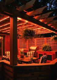Lighting the Kitchen Because decks so often get used at night, lighting an outdoor kitchen is as important as lighting an indoor one (Figure 5). In addition to the regular railing and step lighting, it’s good to add hanging fixtures for soft down lighting on the countertop. To be able to see what’s cooking, add directional spotlights to brightly light the barbecue. A switch will be needed to turn off the spots when not in use. Hanging lights will need to attach to an overhead structure. These lights are usually low voltage and run off the same transformer as the rest of the deck lighting.