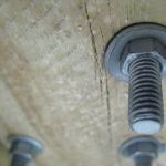 Four 3/8-inch by 5-inch galvanized lag screws are used to fasten the bottom plate to the post. Holes are predrilled in the plate but pilot holes are required in the 4x4s to prevent splitting.
