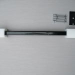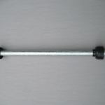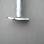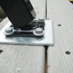 UltiMount ProSpec 36 (americanwaymfg.com). This post is made of a medium-gauge square steel tube with a 3 3/8-inch base plate. A heavy-duty 42-inch post is also available, as are kits for concrete and wood decks. The wood-deck kit includes a post, surface leveling plate, leveling bolts, block reinforcing bottom plate, and anchor bolts. While the posts are 31 inches tall, plastic top-rail stabilizer caps extend the overall height to 36 1/2 inches. The lower post stabilizer is a sheet-metal ring welded onto the post; a separate snap-on plastic rail stabilizer is installed once the post is fixed to the deck.