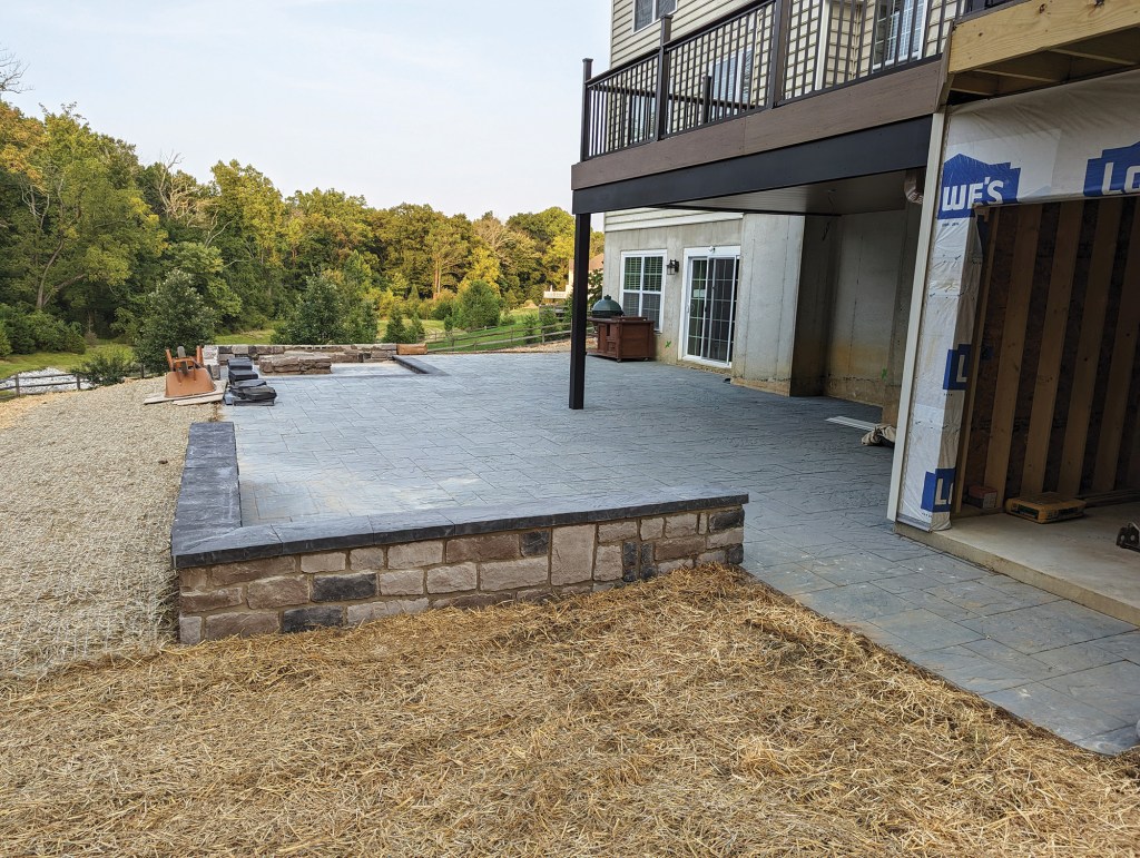 The block sitting walls at the corners of the cast-stone-paver patio are supported by full below-frostline footings.
