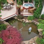 This hot tub is on the lowest level of a three-level deck, complete with a sound system and lighting. A small pond and landscaping soften the area.