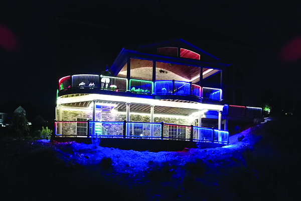 One of the biggest challenges of the project, however, was re-creating the lighting effects that had been built into a previous deck that the clients had owned in another state. They wanted to be able to control the color of each railing segment on the deck and on the patio below, as well as the lighting along the perimeter of the deck and the roofline. Each staircase tread would also have its own light source.