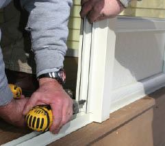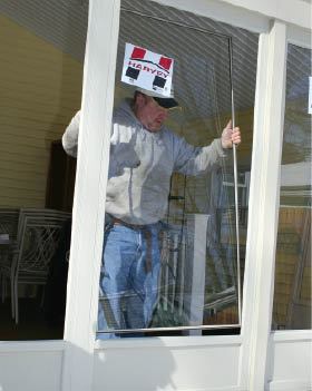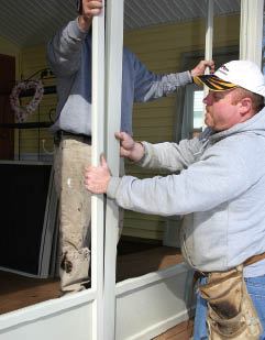 4. With the glass or screens removed to lighten the panels and reduce the risk of damage, join two panels with an H-channel that’s cut to fit between the top and bottom tracks.