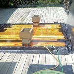 While I’m building the jigs, I soak the cedar 1×4 rail stock in water for a minimum of 48 hours. Then I heat the lumber in a steamer I built from 4-inch-diameter PVC pipe, using a wallpaper steamer as the heat source. The curve’s radius determines how long the rails remain in the steamer; for gentle curves, it takes about two hours before 1x4s are pliable enough, and for tighter curves, about four hours. The lumber is never warmer than 200°F, but it’s still pretty hot when it comes out of the steamer, so I work quickly and keep a good pair of work gloves on hand.