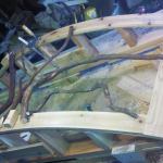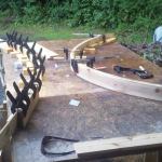Building jig. I leave the rails clamped to the bending jig for at least 24 hours, then put them into storage while I put together my building jig. I keep the rails under pressure, usually with stacked concrete blocks and pieces of lumber, to help them hold their shape.
