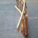 Usually I have a few very long or crooked sticks left over from a previous section. These more intricate branches become the starting point for a new section, sometimes as an “X” shape in the middle, sometimes as two or more long sticks with similar curves. After I’ve installed a few main sticks in a section, I fill in the spaces that are left. The trick here is to just use the sticks as they come; a stick either works in a particular spot, or it doesn’t.
