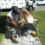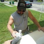 To mark cut lines that were square to the base of the columns, I rolled up a length of 4-inch-wide aluminum coil stock and wrapped it around the column to use as a straightedge. The manufacturer says that PermaCast columns can be cut with a carbide blade in a circular saw, but I find that the resulting edge is pretty rough. Instead, I make these cuts using a 4 1/2-inch angle grinder equipped with a diamond masonry blade, which results in a smoother and more controllable cut.