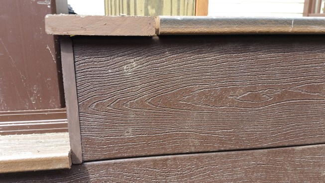 That’s why we try not to use mitered corners on composite decks as much as possible. For example, at 90-degree corners, we prefer to install the border decking in an alternating herringbone pattern.