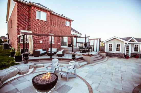 We used Trex Transcend capstock composite decking, trimming the edge of the deck with contrasting PVC fascia and risers. We installed the decking in multiple directions to differentiate the various functional areas on the multi-level deck, and linked the deck to the hardscaped area with a pair of curved staircases. A contrasting color for the treads and subtle LED lighting in all the posts and risers ensures a safe transition between areas.
