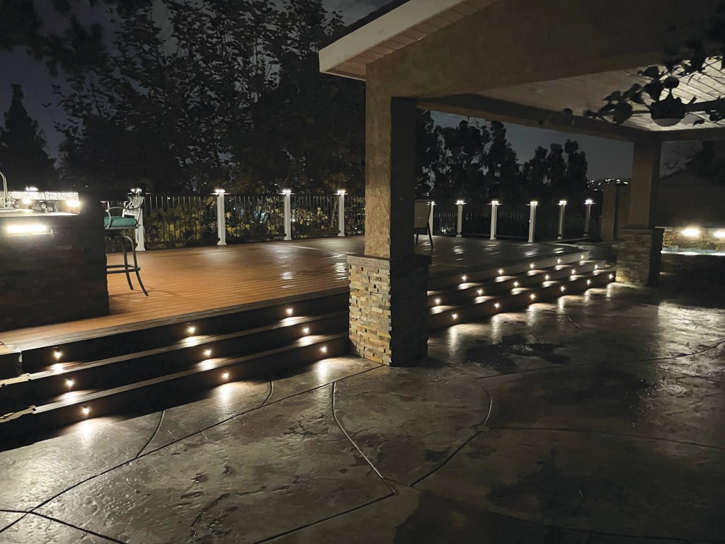 To illuminate the steps for both safety and as a design element, we installed a series of recessed lights in the risers. These are part of the package of 57 Trex step and cap low-voltage lights that illuminate the deck and railing. ❖