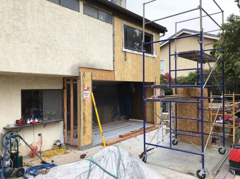 In the first phase of the project, the author reframed the wall facing the back yard to accommodate a wide five-panel hinged patio door.