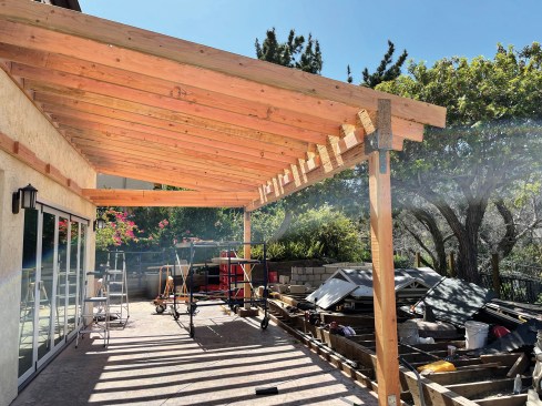We anchored a pair of 6×6 posts to the footings with seismic brackets, then lifted a big PSL beam into position on top of the posts. After connecting the beam to the posts with more seismic hardware, we hung the patio cover’s 2×8 rafters and 2×6 ceiling joists, then sheathed and shingled the roof.