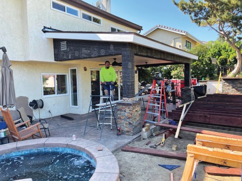 Last year, to prep for the major backyard living project described in this article, I installed a wide La Cantina five-panel hinged door that opened onto an existing concrete patio behind my client’s home. While we had the wall opened up to beef up the framing seismically with Simpson Strong-Tie Strong-Wall shear wall panels and a 20-inch-high PSL header for the wide door, we upgraded the electric to provide controls and wiring for a planned patio cover and a new 1,000-square-foot deck. Recently, I returned with my crew to finish up the project, located in the hills of California’s northern Orange County.
