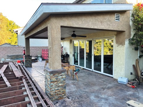 While the stucco contractor stapled up lath and started applying colored stucco with a Spanish texture to the patio cover, we began framing the new deck, which is elevated a couple of steps above the level of the patio. Finished with Trex Transcend tiki torch decking with a lava rock border and a matching Trex railing, the new deck provides the homeowners with a better view of the nearby Santa Ana Mountains when they are snowcapped in the winter.