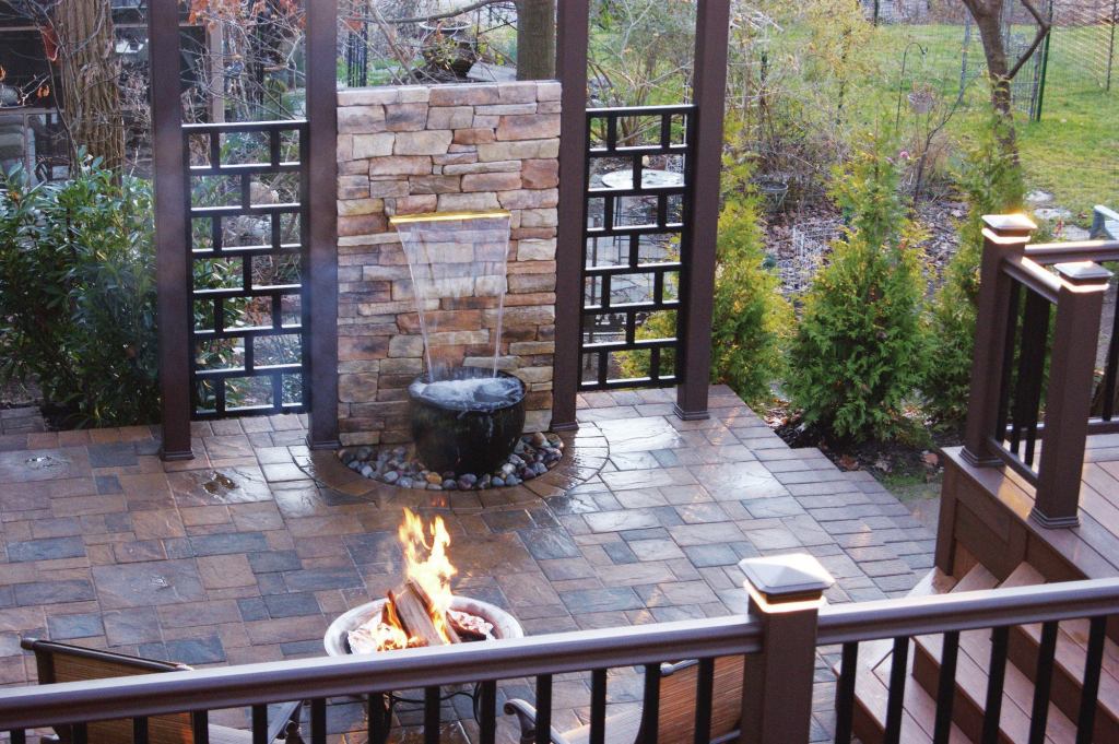 New Jersey deck builder Sean McAleer mixed elements of nature together to bring this multilevel deck to life after dark. Key to the design is an Eldorado stone (eldoradostone.com) privacy wall on the lower patio level, along with a modified Colorfalls waterless pond system (atlanticwatergardens.com). Integrated into the wall is an illuminated waterfall that first cascades from a 24-inch-wide scupper into a ceramic vessel with internal lighting, then overflows into a self-contained basin beneath, where the water is collected, filtered, and recirculated back to the scupper. At night, it appears that light is pouring down to fill the basin, while firelight and ambient light reflected by the overflowing water give movement to the basin’s glazed finish. And, of course, there’s the splashing sound of the waterfall, always a soothing element to add to any design.