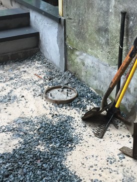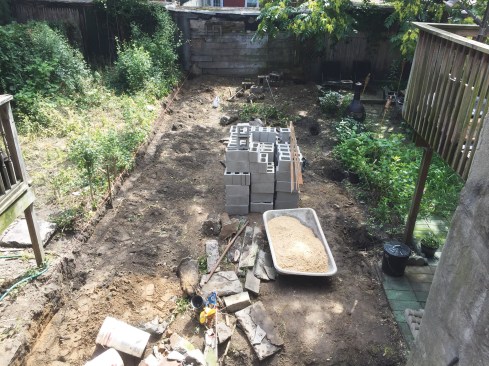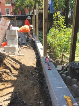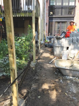 While the landscaping sub dug the retaining-wall trench and post holes along the string line by hand, materials were brought in, also by hand. Without truck access, all materials needed to be manually carried in from the street side of the property. Deliveries were curbside, and then the landscapers entered the building through a door under the front stair and carried the materials through the house to the backyard by hand, in bags or in buckets.