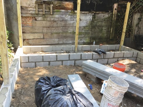 While laying up the CMU perimeter wall, masons also created a small planting bed at the back of the yard …