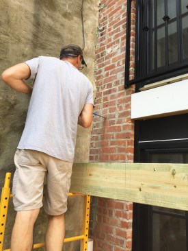 Being that I was one of the carpenters, it was now my turn to carry materials in. Between the length of the ledger and joist stock and the tight turn to enter below the front stoop, we had to bring all the deck lumber in through the story above and lower it down into the backyard.