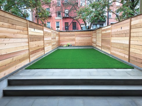 Surrounded by a fence composed of red cedar boards, the backyard is covered with artificial turf instead of grass.