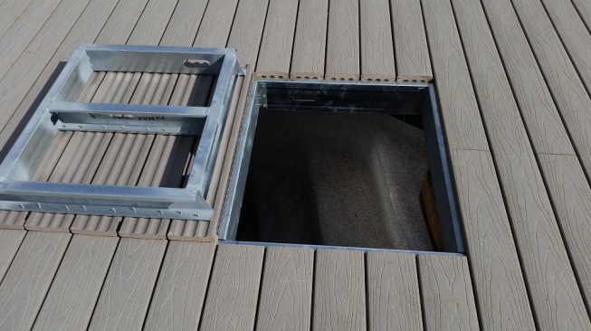 In this case, our client chose to build a rectangular step-up deck set completely over the free-form pool because she wanted no visible reminder of the traumatic event that precipitated the deck construction. We framed the deck conventionally with galvanized steel joists that rest on the pool edges and span its 16-foot width, and we finished it with ChoiceDek composite decking and a matching composite skirt around the perimeter. To provide access below the deck, we added a hatch.