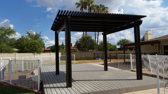 We added a powder-coated aluminum Alumawood pergola for shade at one end of the expansive deck, using the deck structure for support.