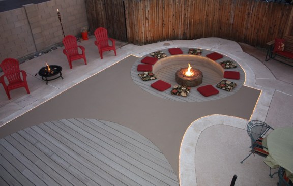 The composite decking around the fire pit and at the larger end of the pool is AERT’s MoistureShield, while the center section of the deck has a plywood cover with a special acrylic coating for weatherproofing. Again, we built a hatch into the structure to provide access below deck for extra storage and to maintain the sump pump at the bottom of the pool. LED rope lighting around the edge of the deck inserted in the space created between the new deck and the old bull-nosed pool coping further enhances the ambiance of the space. The owners tell us that they now use their backyard far more than they ever did when they had their pool.