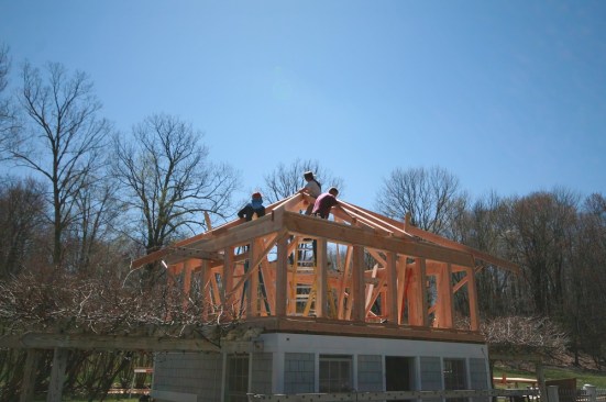 Capped by its new roof, the second-story addition is ready for window and door installation. Note that the cupola has been reinstalled.