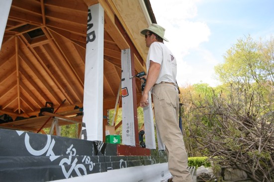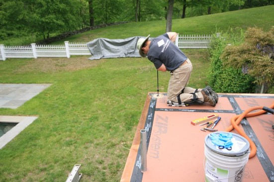 The post pipes were sealed to the deck sheathing with the Acrylabs roof coating. Later, 2×4 PT blocking will be installed around the pipes to form a base for the post wraps.