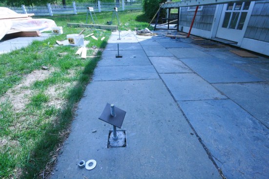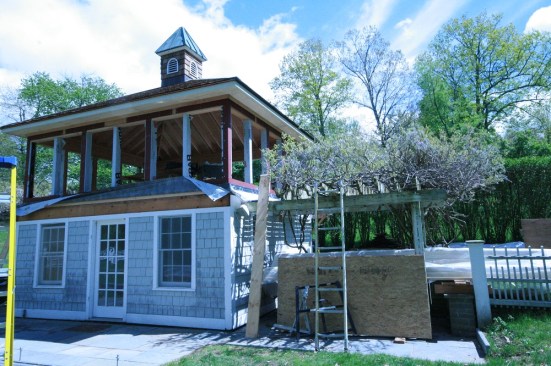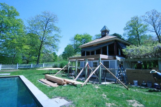 The original pool house. Piers have been poured for the new deck, and new bluestone pavers have been installed. The next step is to remove the cupola, which will be reinstalled later.