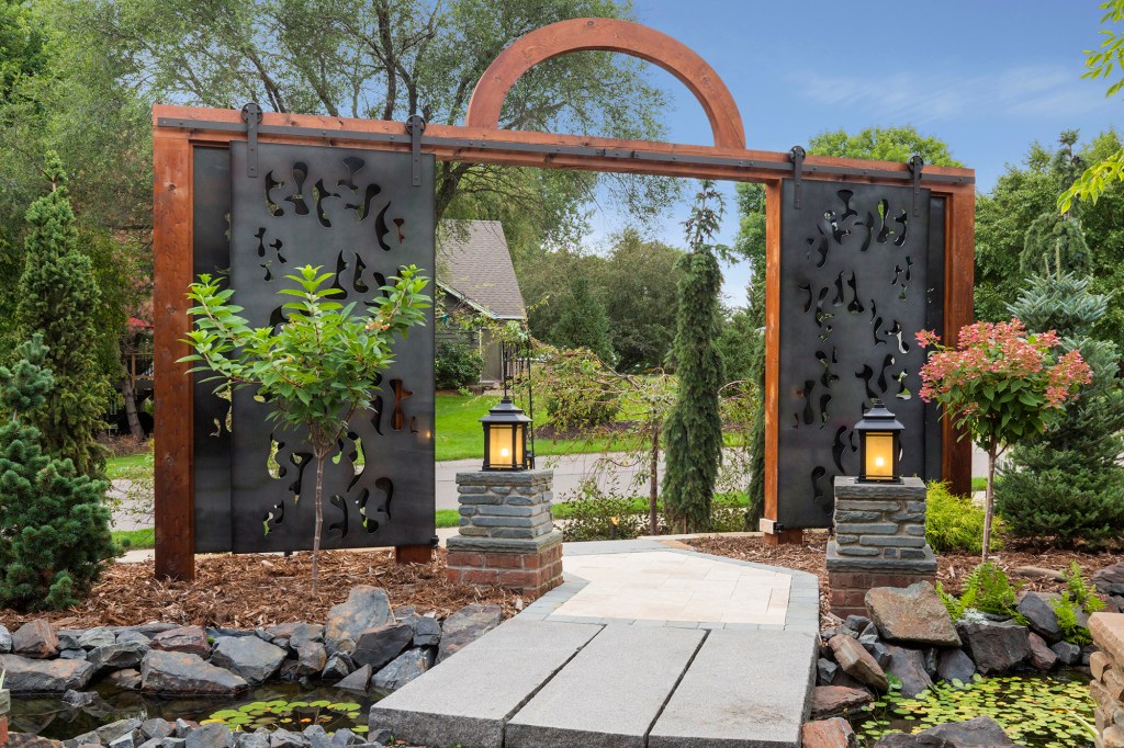 Blue spruces once screened an extraordinary water feature in the front yard of this Eden Prairie, Minn., home from the street and neighbors. But the 30-year-old spruces started dying, and the homeowners weren’t willing to wait years for a new row of trees to mature and fill in. Since the city wouldn’t permit the family to put up a tall privacy fence, we replaced the trees with a series of freestanding timber-framed architectural panels and a space-saving barn-door entry gate.