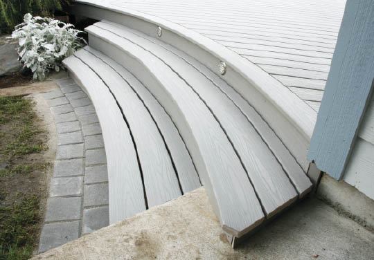 How Much Time to Budget?Clearly, building curved stairs adds both visual appeal and significant extra labor to a project. How much extra labor is a tough question to answer because of the variables. Not only do different crews work at different paces, but the stairs themselves vary. A curved stair could have curving treads and straight sides, or it could have straight treads and curved sides. That, by the way, may be the simplest option if you don’t have the means to heat and bend composite decking for the treads. Arcing stairs take about twice as long to build as a straight stairs. Add to that the time it takes to bend tread material and install a curving railing, and you can see the hours adding up. |