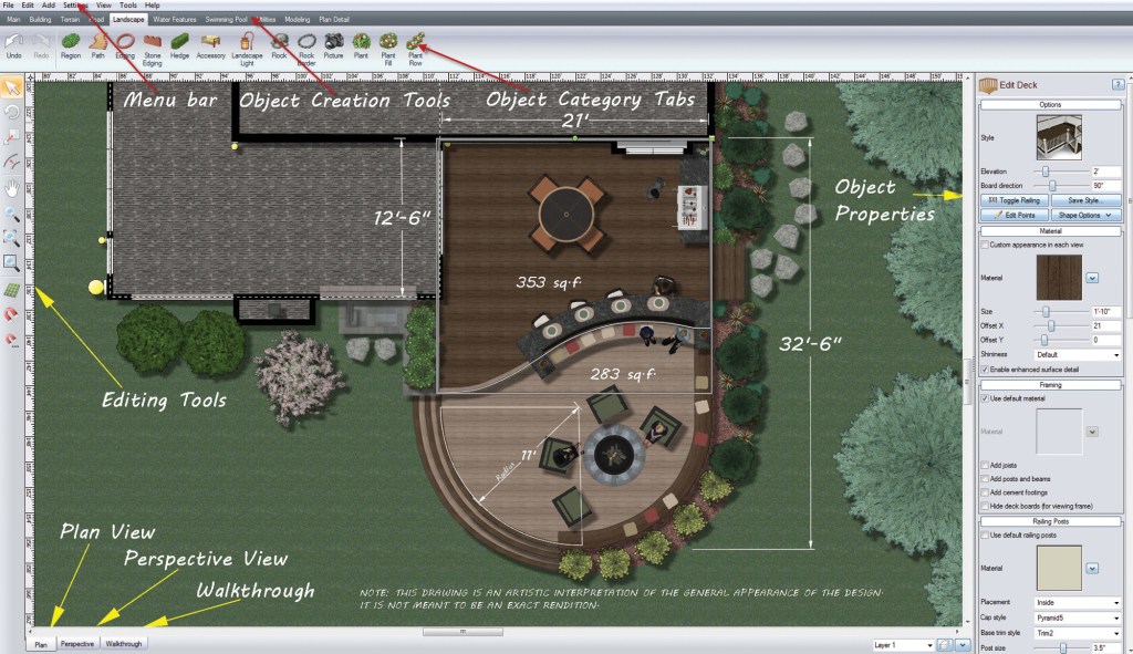 Don’t let the name of the software fool you. Sure, it’s loaded with an extensive library of landscaping features, such as climate zone–specific plantings and trees, and water features, such as ponds, pools, and hot tubs. And the library of deck options is limited compared with what more deck-specific software offers. Still, it can produce amazingly lifelike 3D renderings of decks, houses, patios, gardens, and other outdoor living features to create a realistic view of your design. In addition, you can do the following: