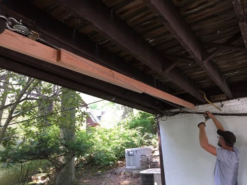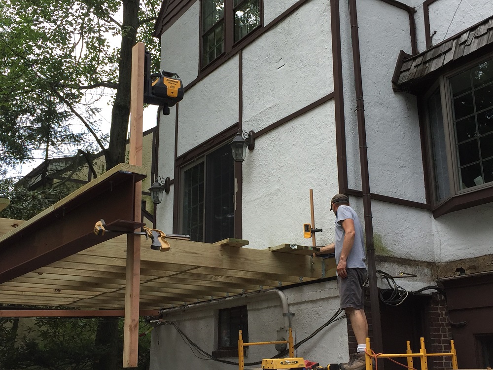 Fortunately, our clients received their insurer’s OK for the full scope of work and gave us the go-ahead to get started on the project. In New Jersey, permit application requirements vary from town to town, and even though we were not changing the deck’s footprint, the town required a copy of the survey showing the original deck’s location – to keep us honest, I guess – and an architect’s plan detailing deck construction. Two items we inherited from the existing deck were incorporated into the new plan: a 24-foot-long W10 cantilevered steel girder that supported the old deck framing, and an electrical service head attached to the southwest corner of the deck.