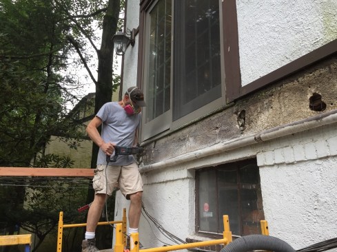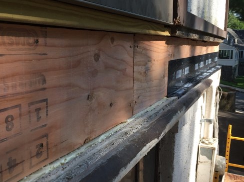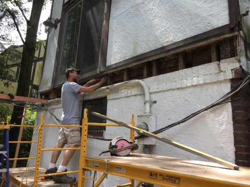 After resheathing, the crew waterproofed the exposed wall with self-adhering flashing tape installed to lap over the stucco cladding.