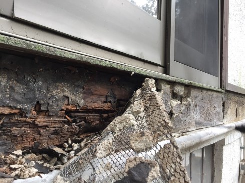 Cutting away the stucco revealed considerable damage to the sheathing and cripple studs underneath the sliding door leading out onto the deck.