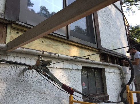 The service drop was temporarily supported by a wood-framed tripod. Note the steel beam cantilever, required to provide access to one of the garage doors at ground level.