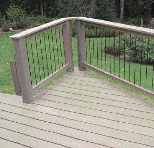 Figure 1. Stock pieces of EverGrain Designer Universal Rail form the frame for the author’s vertical-rod railings. So he can use deck boards for the cap rail, he has removed the ridge from what will be the upper rail (right in photo), with a circular saw.