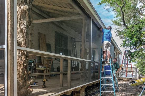 Greg DiBernardo, of Peachtree Decks, in Alpharetta, Ga., uses a local shop to make his panels. “We don’t use any of the screen kits that are out there,” says DiBernardo, who builds his porch walls with stops and has aluminum-framed custom panels fabricated that are then screwed into those stops. “It’s a much cleaner look overall. They aren’t that expensive. A typical porch might cost us $500. We get them delivered to the site for $50, and our guys go over and, in less than an hour, screw them in. Our fabricator gets them to us no more than two or three days after we call them in.”
