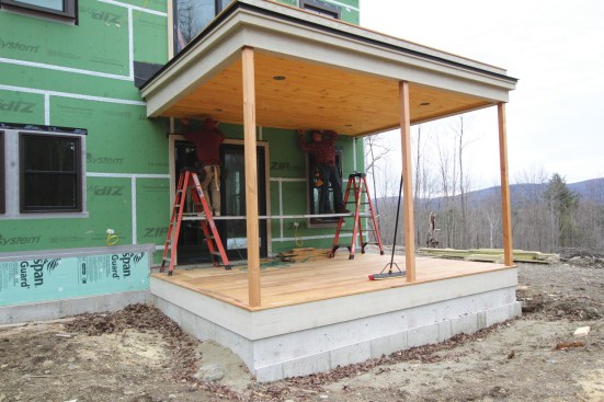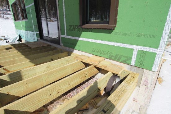 Unlike the rest of the house, though, there’s no insulated slab on top of the stem wall; instead, we installed an interior perimeter drain on top of the footing that runs out through the foundation to daylight, wrapped the drain with filter paper, and backfilled with sand and gravel. We left at least a foot of clearance between the top of the gravel and the bottom of the pressure-treated (PT) deck framing for air to circulate; any water that enters the porch and drains through the gaps between the decking has an escape route through the foundation drain.
