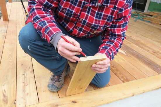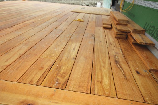 This was our first encounter with this type of decking, which we found to be a little challenging to work with. One issue that we had with the 5/4×6 decking is that it arrived from the supplier in random lengths, with a considerable percentage of shorter 5- and 6-foot lengths in the mix. In addition, the Select & Better grading seemed to vary considerably, and we had to sort through the pile to mix and match boards that had reasonably consistent grain, knots, and coloring. These two factors contributed to a larger than average amount of waste.