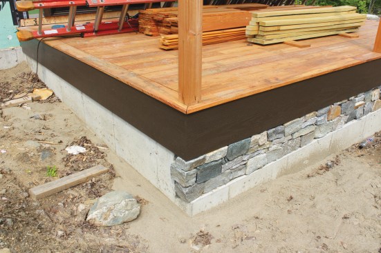 Instead of being supported by piers, like most decks and porches, this deck bears on a poured concrete stem-wall foundation. It was formed with a shallow shelf to help support veneer fieldstone cladding that matches the foundation detail used on the rest of the house.