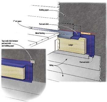 Tearing into siding is all but inevitable if you build decks on existing houses. It’s necessary to remove (and replace) several courses of siding to flash a ledger properly; only then do you have access to lift the building paper and apply peel-and-stick membrane and metal flashing the requisite 6 inches up the wall (see illustration, above). Also removing a little siding beyond the left and right ends of the proposed ledger allows you to apply peel-and-stick membrane there to protect against leaks. The flashing can then lap the top of a lower course of siding, or the foundation, so any water that does get into the joint will be directed outward.