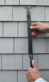 Figure 14. A J-shaped zip-lock tool (top) grabs the bottom lip of vinyl siding, disengaging it from the course below (above).