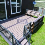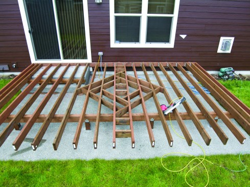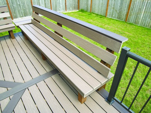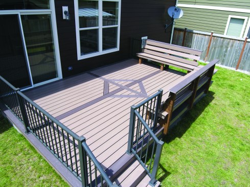 This straightforward deck was built by contributing editor Kim Katwijk of Deck Builders Inc. in Olympia, Wash. The inlay, simple as it is, required a lot of blocking so that all the pieces would be supported within 3 inches of their ends (for a more complicated project, see Eye for Design, March/April 2009; deckmagazine.com). Note that the blocking is installed vertically, for strength. An extra joist at each end of the deck supports the darker band of decking around the perimeter. The decking is two contrasting colors of Azek Deck — Kona and Sedona — fastened with complementary-colored GRK Kameleon screws; matching deck boards on the benches finish off the design (see “Benches Built for Comfort,” May/June 2008; deckmagazine.com). The aluminum railing system is from Metals USA.