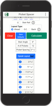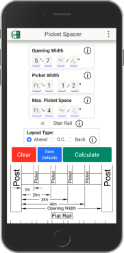 My goal was to create an application that is quick and easy to use, and that would provide answers to common deck-framing questions with just a few clicks. For example, when laying out pickets, you can input the minimum spacing or set a default value for the minimum to speed entry. The app automatically limits the picket spacing so that openings are less than 4 inches, as required by code. The app can also calculate the spacing for sloped-stair railing pickets. And to help speed things along, the app is able to store default values for many of your most-commonly used measurements.