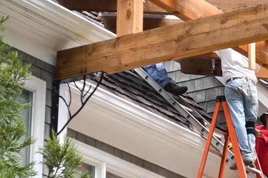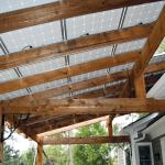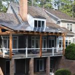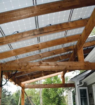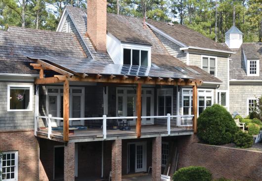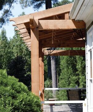 There’s something poetically efficient about using solar panels to provide shade. The 6.5 kilowatt system shown here generates 26 to 30 kilowatt hours per day, about what the average U.S. household uses. Total cost for the project, including the pergola, ran about $40,000; after federal and state tax incentives (30 and 35 percent, respectively) are accounted for, payback for the homeowner should take only eight or nine years, says Russell Seifert of Creative Solar USA (creativesolarusa.com) in Woodstock, Ga. Because the pergola serves as the “rack” to support the panels, it was eligible for the incentives as well. Timber-framed with cedar by RL Smith and Associates (rlsmithandassociates.com) of Maysville, Ga., it sports 8×8 posts, 6×10 and 6×12 beams, and 4×10 rafters, says Daniel Sims, co-owner of the company. Angle irons that are both structural and decorative attach the pergola to the house framing. They were made by The Iron Twig (theirontwig.com), which is also co-owned by Sims. — Laurie Elden