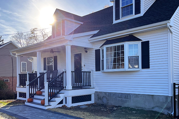 Finishing up, we used a solid triple 4-inch vinyl soffit for the porch ceiling and installed a ceiling fan to help with airflow on the hotter days of summer. To complete the welcoming front porch on the homeowner’s renewed Cape Cod–style home, we laid a hardscape walk from the driveway to the stairs.