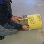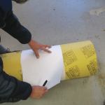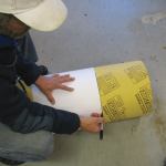 One method involves newspaper. I tape two or three full pages of newsprint end-to-end to make an elongated sheet, then wrap the sheet around the footing form. I keep the sheet snug as I wrap, and match the edges of the sheet as they meet around the cylinder. Then I tape the end of the newsprint to itself and slide one edge of the newsprint to the cut point. When it’s in position, I mark my straight line along the edge of the newsprint.