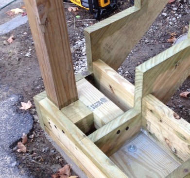 Next, I cut a 2×10 bottom cleat and a 2×6 sub riser equal to the width of the stairs, minus three inches. The stringers are fastened to these components, which are used to attach the staircase to the landing pad and also to help strengthen the stringer-to-guard post connection. Before assembly, I trim 1 ½-inches from the bases of the interior stringers and 1 ½-inches from their ends, and apply wood preservative to all cuts and holes.